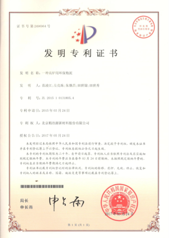 精冶源是一家擁有持續(xù)創(chuàng)新能力的國家級高新技術(shù)企業(yè)。自成立以來,公司科研團隊潛心鉆研,精益求精,在炮泥領(lǐng)域已取得四項發(fā)明專利和實用新型專利。公司科研團隊將繼續(xù)銳意進取,不斷創(chuàng)新,取得耐火材料領(lǐng)域的新突破、新成就。