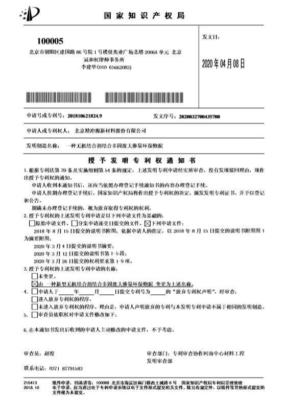 近日,由北京精冶源新材料河北有限公司(簡稱:精冶源;股票代碼:831091)研發(fā)的一種新型結(jié)合劑環(huán)保炮泥喜獲國家知識產(chǎn)權(quán)局發(fā)明專利授權(quán),專利號:201810621824.9。這是精冶源在爐前炮泥領(lǐng)域獲得的第四項(xiàng)國家專利。 傳統(tǒng)炮泥大多以焦油或樹脂為結(jié)合劑,存在諸多缺點(diǎn):焦油系炮泥在使用過程中會產(chǎn)生苯并芘,污染環(huán)境并?!?/p>