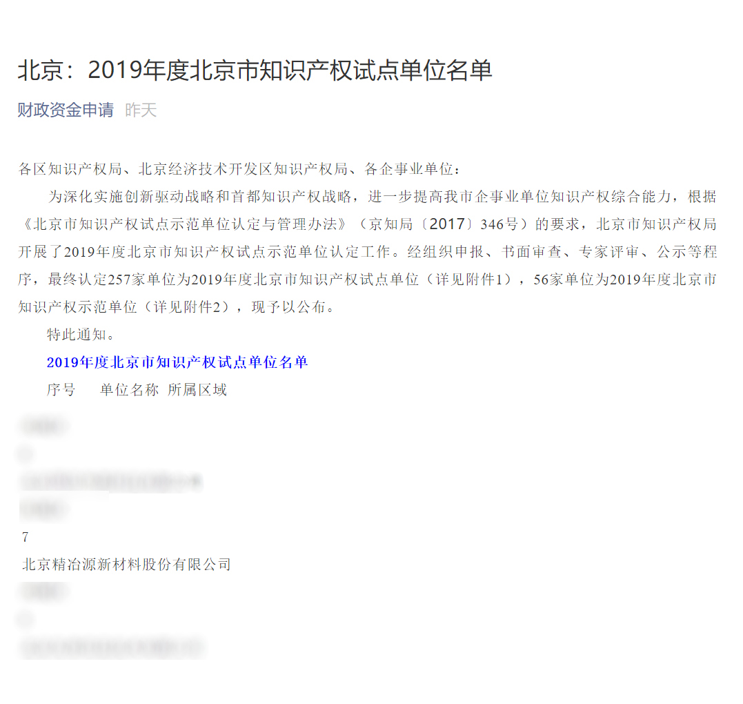 2019年12月下旬,北京精冶源新材料股份有限公司(簡(jiǎn)稱(chēng):精冶源;股票代碼:831091)歷經(jīng)嚴(yán)格而規(guī)范的書(shū)面審查、專(zhuān)家評(píng)審、公示等多項(xiàng)程序,被北京市知識(shí)產(chǎn)權(quán)局認(rèn)定為2019年度北京市知識(shí)產(chǎn)權(quán)試點(diǎn)單位。 此次認(rèn)定要求企業(yè)屬于知識(shí)產(chǎn)權(quán)密集型產(chǎn)業(yè)領(lǐng)域,有持續(xù)創(chuàng)新活動(dòng),有一定數(shù)量的專(zhuān)利申請(qǐng)且近三年專(zhuān)利實(shí)施率不低于40%等多…